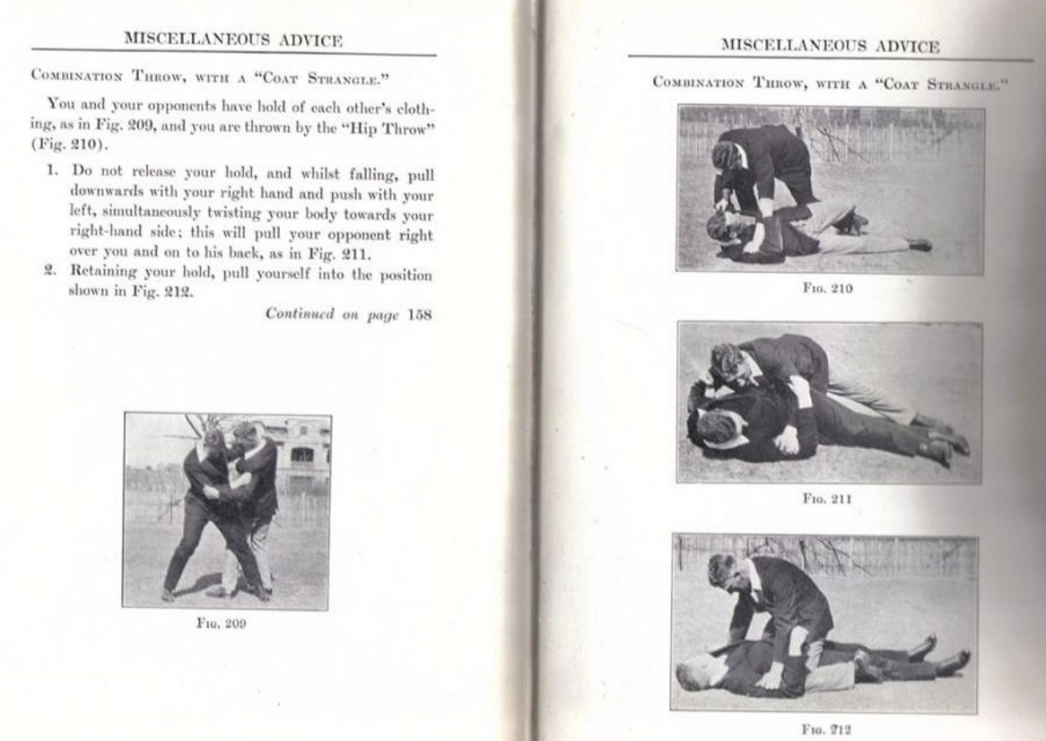 >>214171Maybe I don't know enough about sports fighting but it looks like it appears in the police and self-defense manual Scientific Self-defense by William E Fairbairn>You and your opponents have hold of each other's clothing, as in Fig. 209, and you are thrown by the "Hip Throw" (Fig. 210).>1. Do not release your hold, and whilst falling, pull downwards with your right hand and push with your left, simultaneously twisting your body toward your right-hand side; this will pull your opponent right over you and on to his back, as in Fig. 211.>2. Retaining your hold, pull yourself into the position shown in Fig. 212.