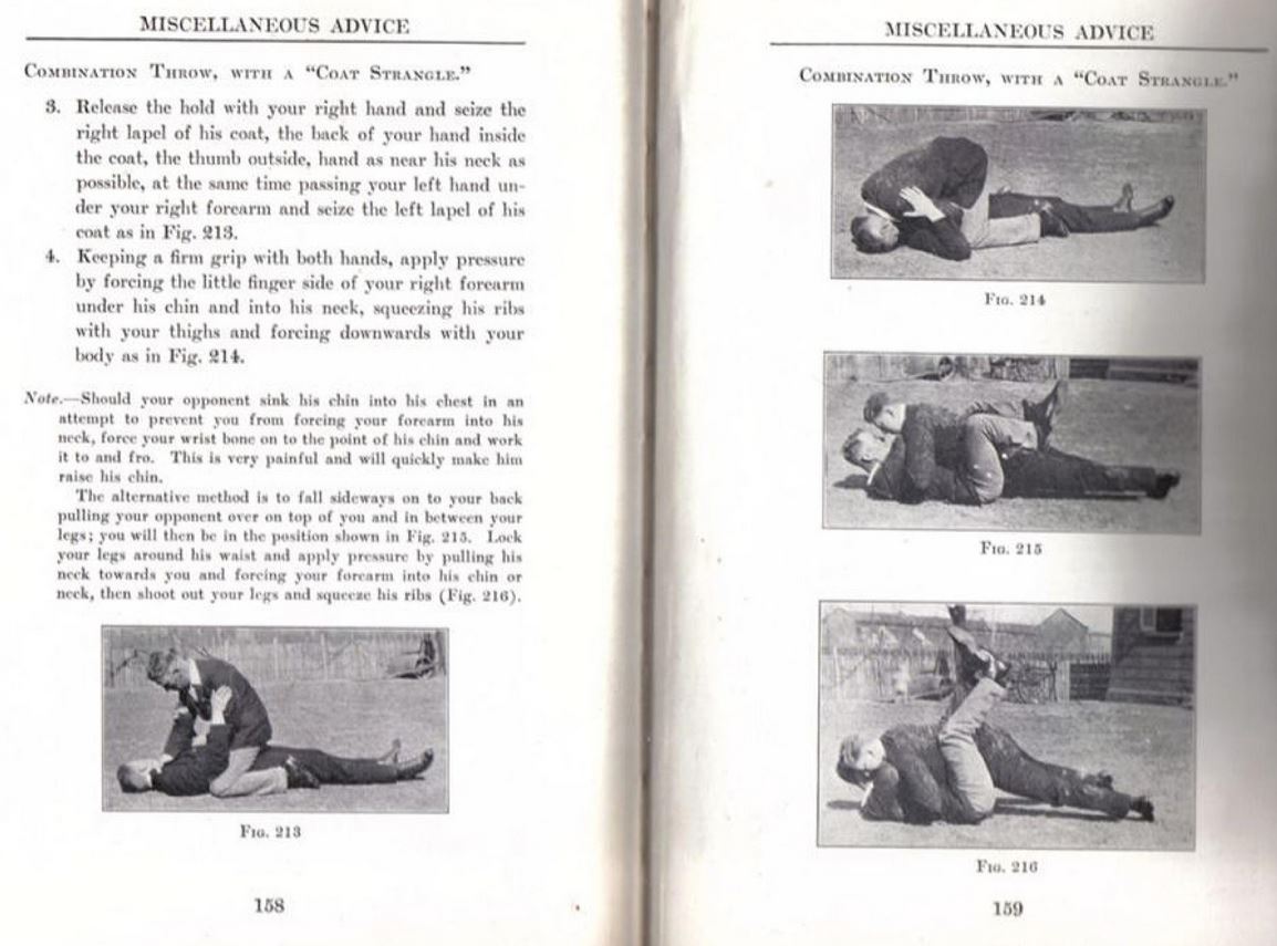 >>254808>>214171>3. Release the hold with your right hand and seize the right lapel of his coat, the back of your hand inside the coat, the thumb outside, hand as near his neck as possible, at the same time passing your left hand under your right forearm and seize the left lapel of his coat as in Fig. 213.>4. Keeping a firm grip with both hands, apply pressure by forcing the little finger side of your right forearm under his chin and into his neck, squeezing his ribs with your thighs and forcing downwards with your body as in Fig. 214.>Note - Should your opponent sink his chin into his chest in an attempt to prevent you from forcing your forearm into his neck, force your wrist bone on to the point of his chin and work it to and fro. This is very painful and will quickly make him raise his chin.>The alternative method is to fall sideways on to your back pulling your opponent over on top of you and between your legs; you will then be in the position shown in Fig.215. Lock your legs around his waist and apply pressure by pulling his neck towards you and forcing your forearm into his chin or neck, then shoot out your legs and squeeze his ribs (Fig. 216)
