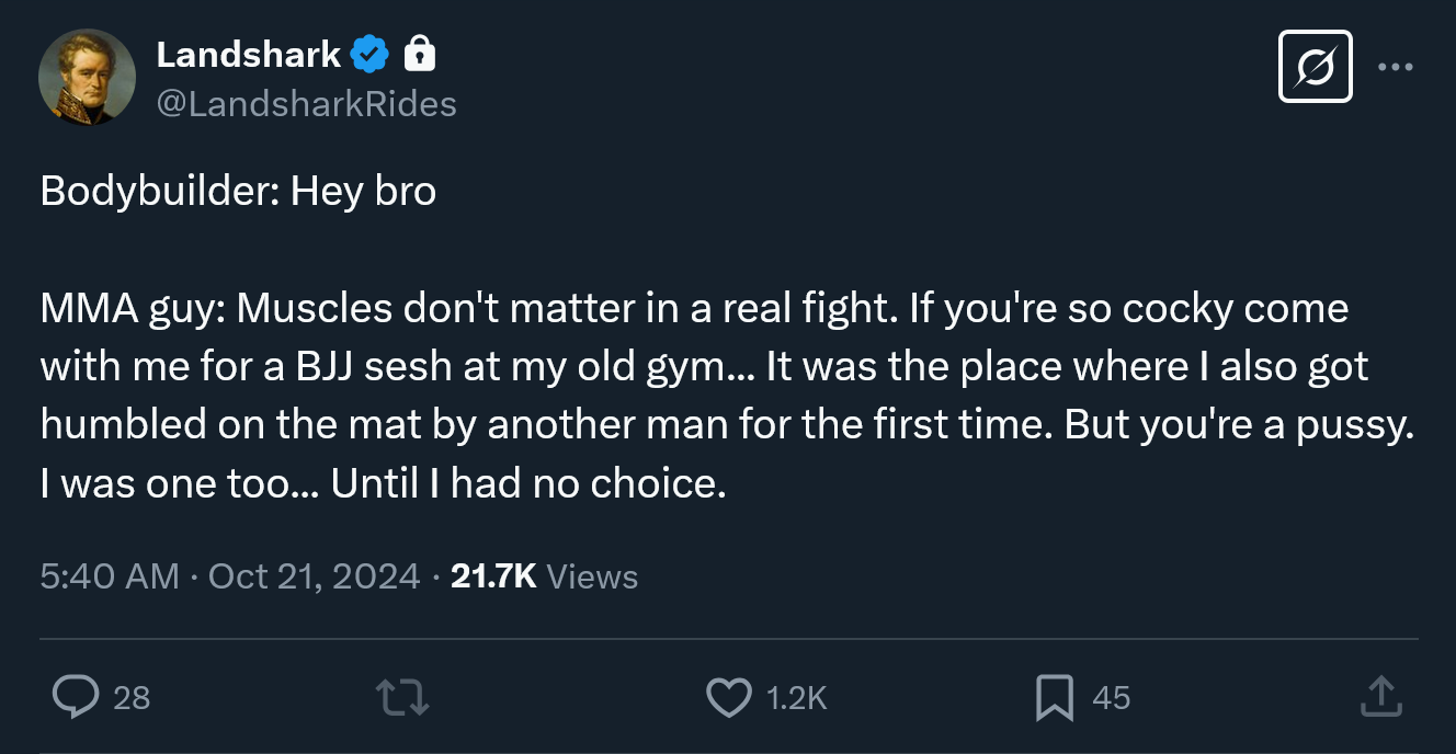 >mma fighter trains endlessly to be an unstoppable force>I bring this to a fight and it’s over in less than 5 seconds
