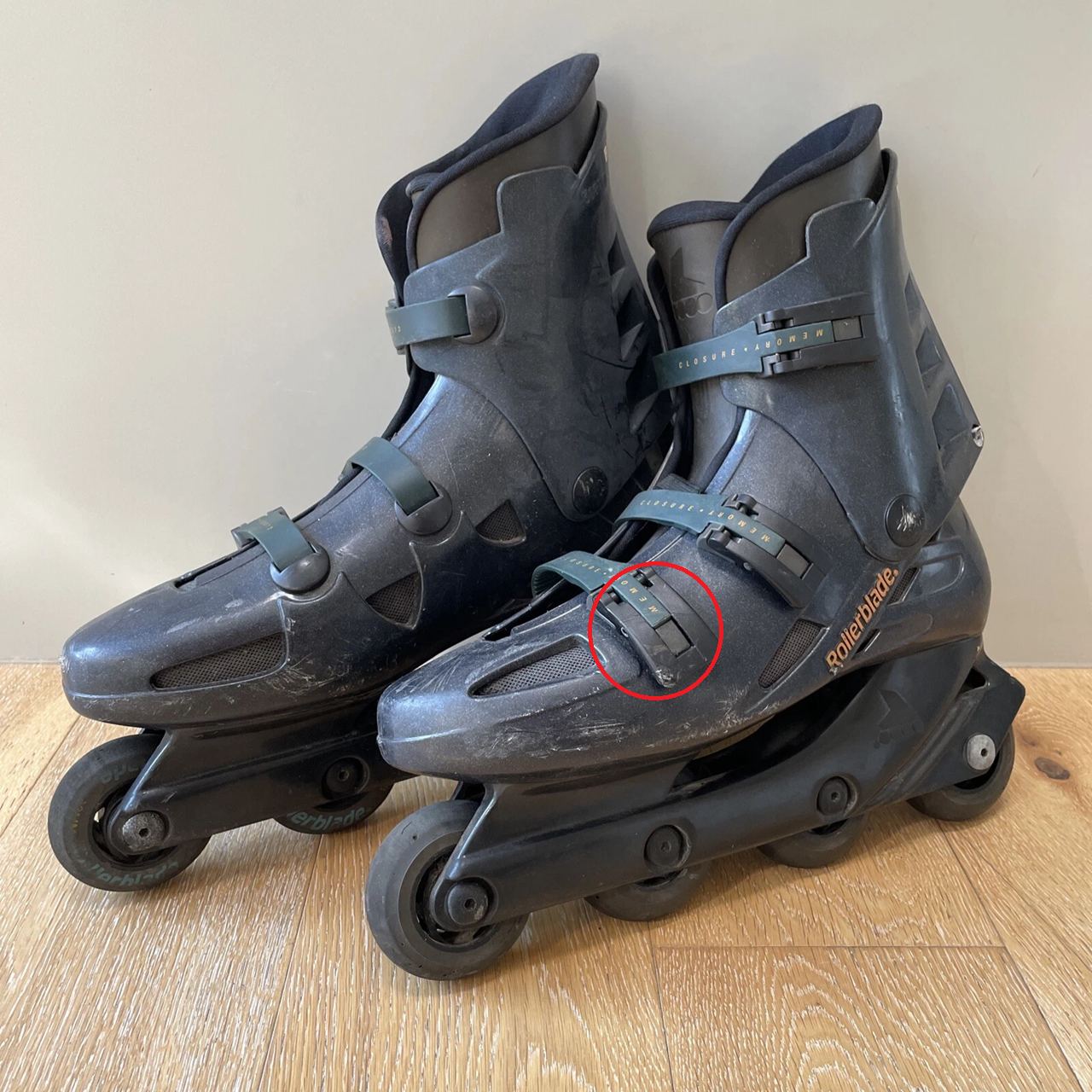 shit, I never come here and didn't think there would be a roller blade thread. It's a year old so I guess I won't get answered for a month but here it is. It got some Rollerblade GLX's from goodwill and I replaced the wheels with some from amazon (AOWESM Inline Skate Wheels ABEC-9 and same size)I really hate using them, I feel like they're really hard and even sound hard compared to the stock blue wheels I got with them. The original wheels feel way more sticky and bouncy compared to these new ones. I learned that I had to "brake in" the wheels but I skated for a few hours and did a lot of carving and dragging to rough them up but they still feel like shit. I want to go to a skate park but I feel like I want to revert to the beat up old wheels. Is that stupid? Also the lowest (toe) strap broke a few days ago - I circled it. They still feel tight enough to use but is this something I can get repaired or is it not worth it. Or is it super dangerous and something I shouldn't use?