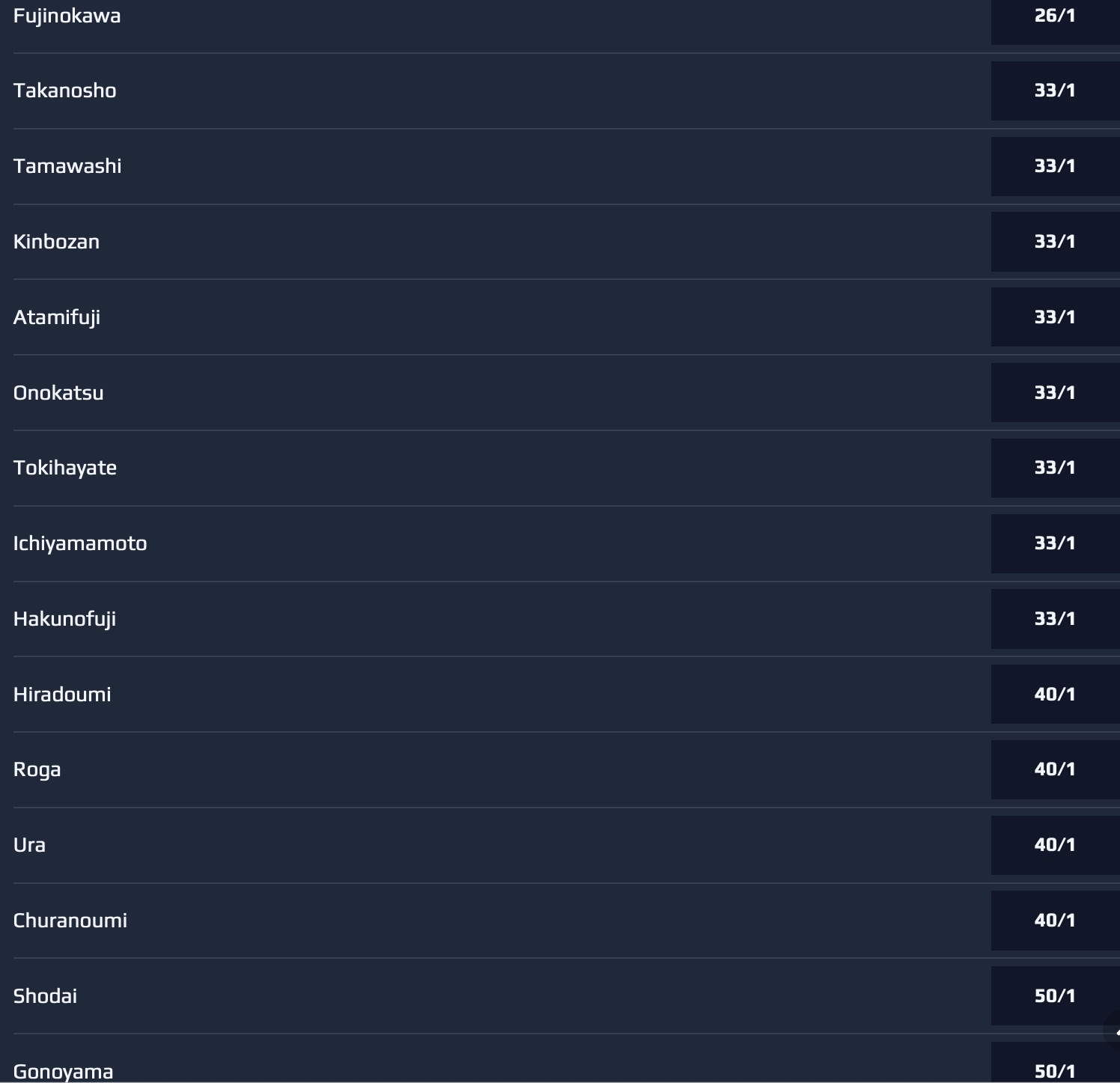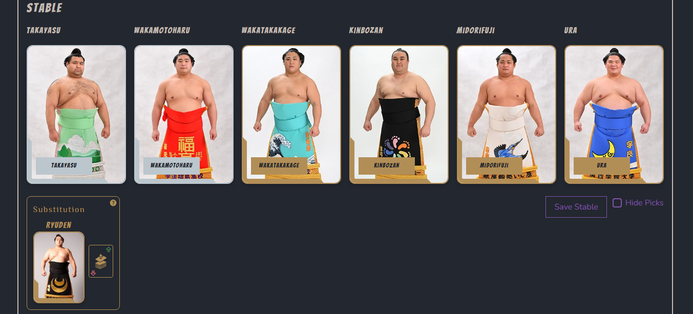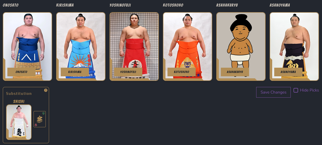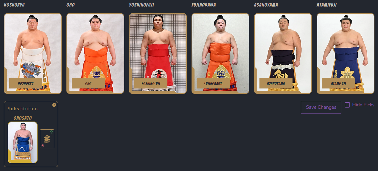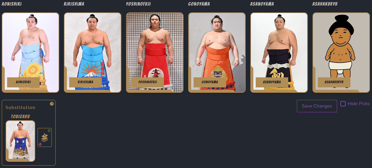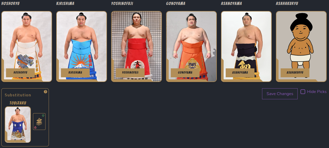 >>252389SadanoumiTsurugisho depending on his knee conditionChiyomaruShimazuumiShiden because he blew his knee last basho