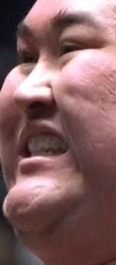 This again? He wears glasses, so when he's on the dohyo he squints. He also wears a mouth guard which makes his mouth protrude a bit. He's not scowling at all.