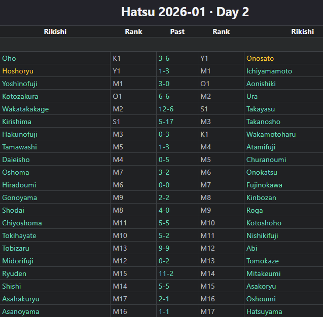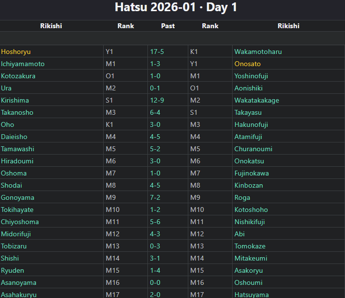 Day 1 in juryo worked out perfectly this time, no stable conflicts, 1e vs 1w, 2e vs 2w … 14e vs 14w.I haven't been paying too close attention, but I don't remember that happening recently