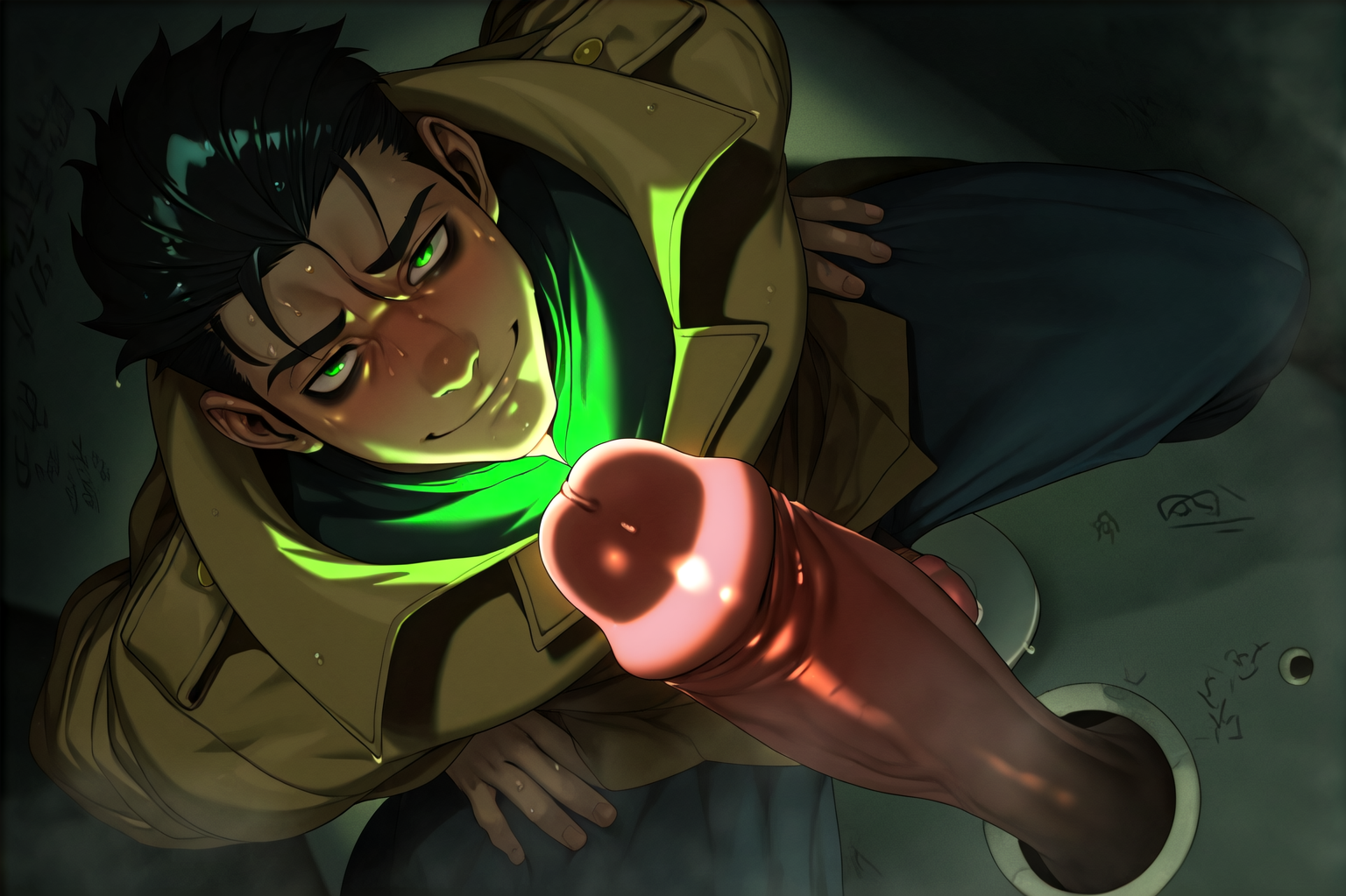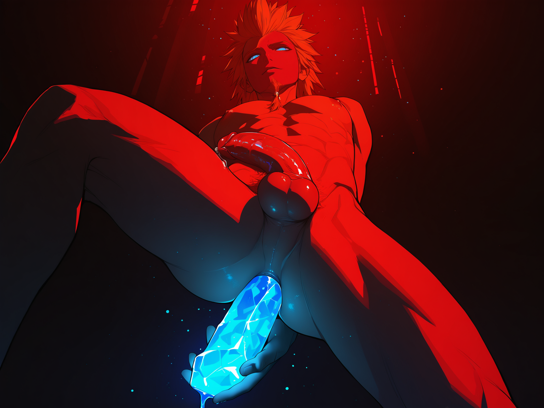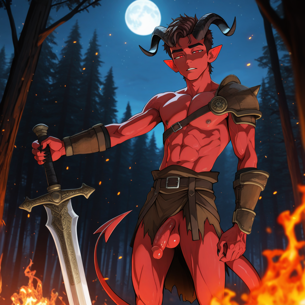 >>3084838to give you an idea, here is the prompt for the images that feature tails:In a dark tavern, dim lighting bathes a striking 25-year-old male with an adventurous spirit, highlighting his slim, lean frame adorned with skimpy, rough leather armor that leaves his chest, midriff, and crotch area entirely exposed. His fair skin has a reddish hue, accentuated by dark red freckles scattered across his angular, masculine face.His medium wavy curly black hair falls in disarray, contrasting with the two short horns at his temples and his demon tail with a triangular tip that curls behind him. Stunning yellow-golden eyes sparkle with smugness and cockiness as he rests his head on his palm, leaning against the bar counter with a partly opened mouth revealing a seductive smile directed straight at the viewer.The focal point of this dynamic pose is his exposed crotch area, where visible chest hair and a happy trail lead to his small, uncut penis displayed in all its glory with great detail. This lascivious image captures him in a cowboy shot with a dutch angle, combining photorealism, digital painting, and anime styles for highly detailed work.A cool color palette of mate pastel colors and soft shadows adds depth to the atmosphere, making his red skin tone stand out against the muted tones of the tavern setting. The overall effect is captivating, enhanced by the intriguing presence of his demon tail, which adds an extra layer of mystique to the portrait.