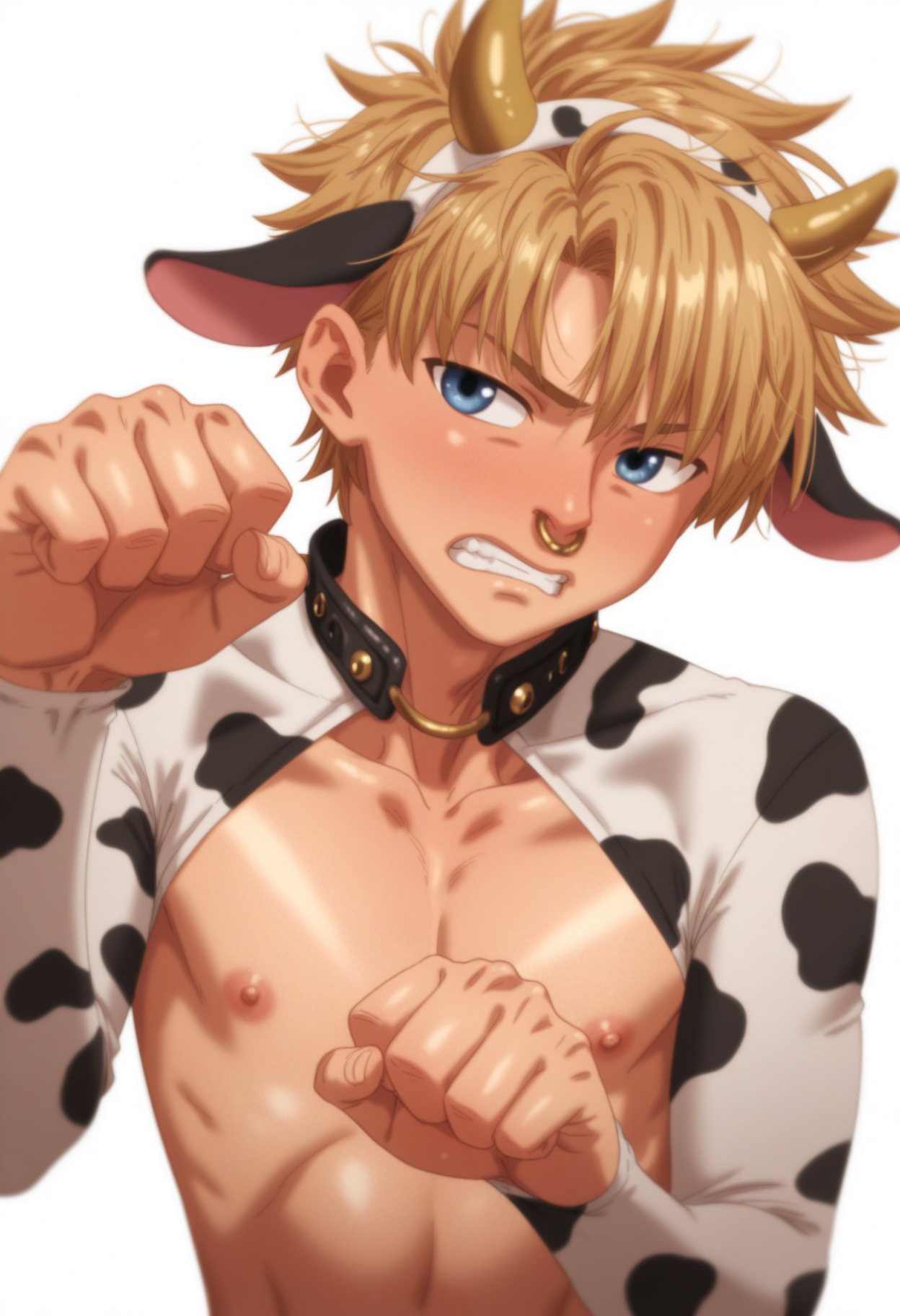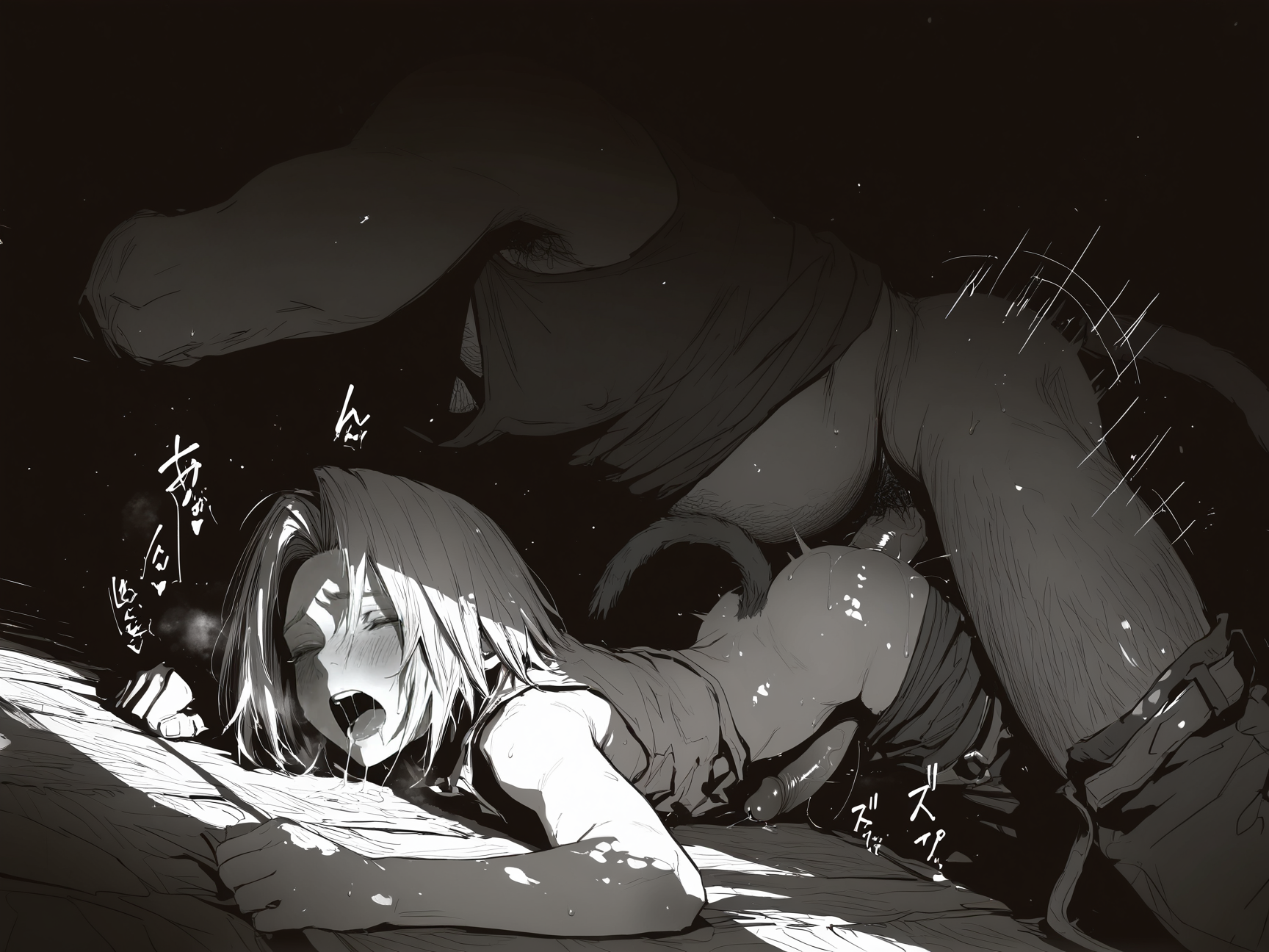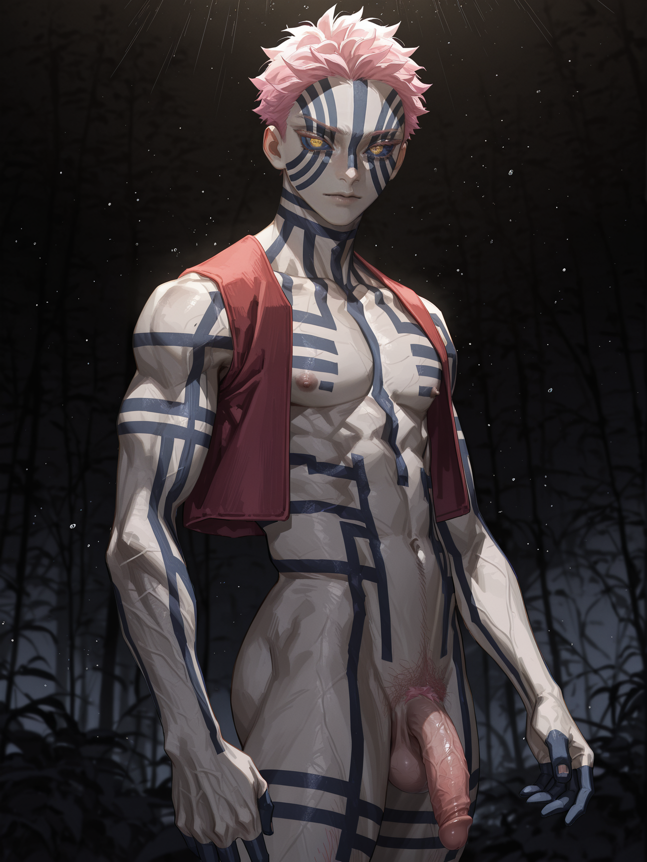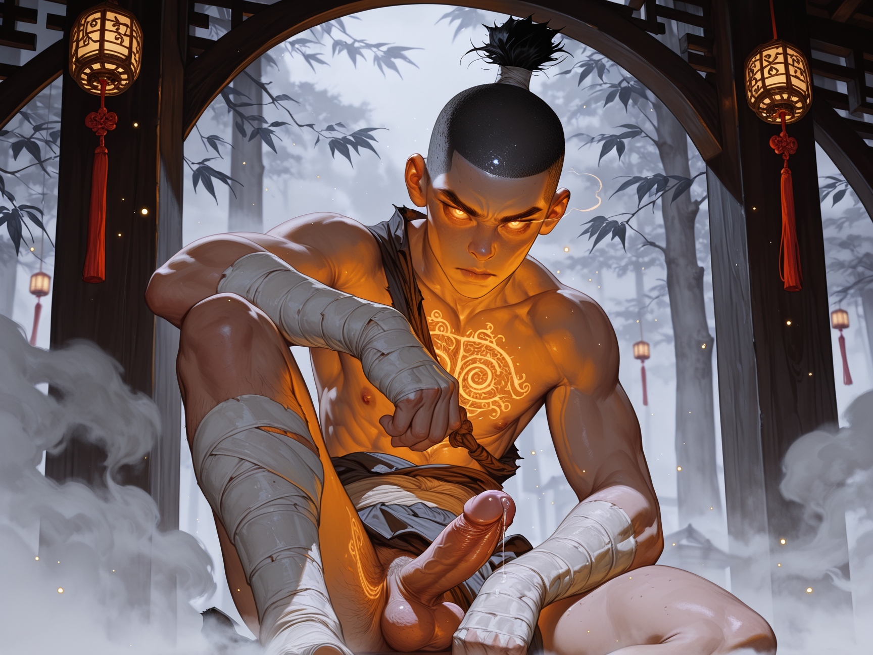 >>3084838to give you an idea, here is the prompt for the images that feature tails:In a dark tavern, dim lighting bathes a striking 25-year-old male with an adventurous spirit, highlighting his slim, lean frame adorned with skimpy, rough leather armor that leaves his chest, midriff, and crotch area entirely exposed. His fair skin has a reddish hue, accentuated by dark red freckles scattered across his angular, masculine face.His medium wavy curly black hair falls in disarray, contrasting with the two short horns at his temples and his demon tail with a triangular tip that curls behind him. Stunning yellow-golden eyes sparkle with smugness and cockiness as he rests his head on his palm, leaning against the bar counter with a partly opened mouth revealing a seductive smile directed straight at the viewer.The focal point of this dynamic pose is his exposed crotch area, where visible chest hair and a happy trail lead to his small, uncut penis displayed in all its glory with great detail. This lascivious image captures him in a cowboy shot with a dutch angle, combining photorealism, digital painting, and anime styles for highly detailed work.A cool color palette of mate pastel colors and soft shadows adds depth to the atmosphere, making his red skin tone stand out against the muted tones of the tavern setting. The overall effect is captivating, enhanced by the intriguing presence of his demon tail, which adds an extra layer of mystique to the portrait.