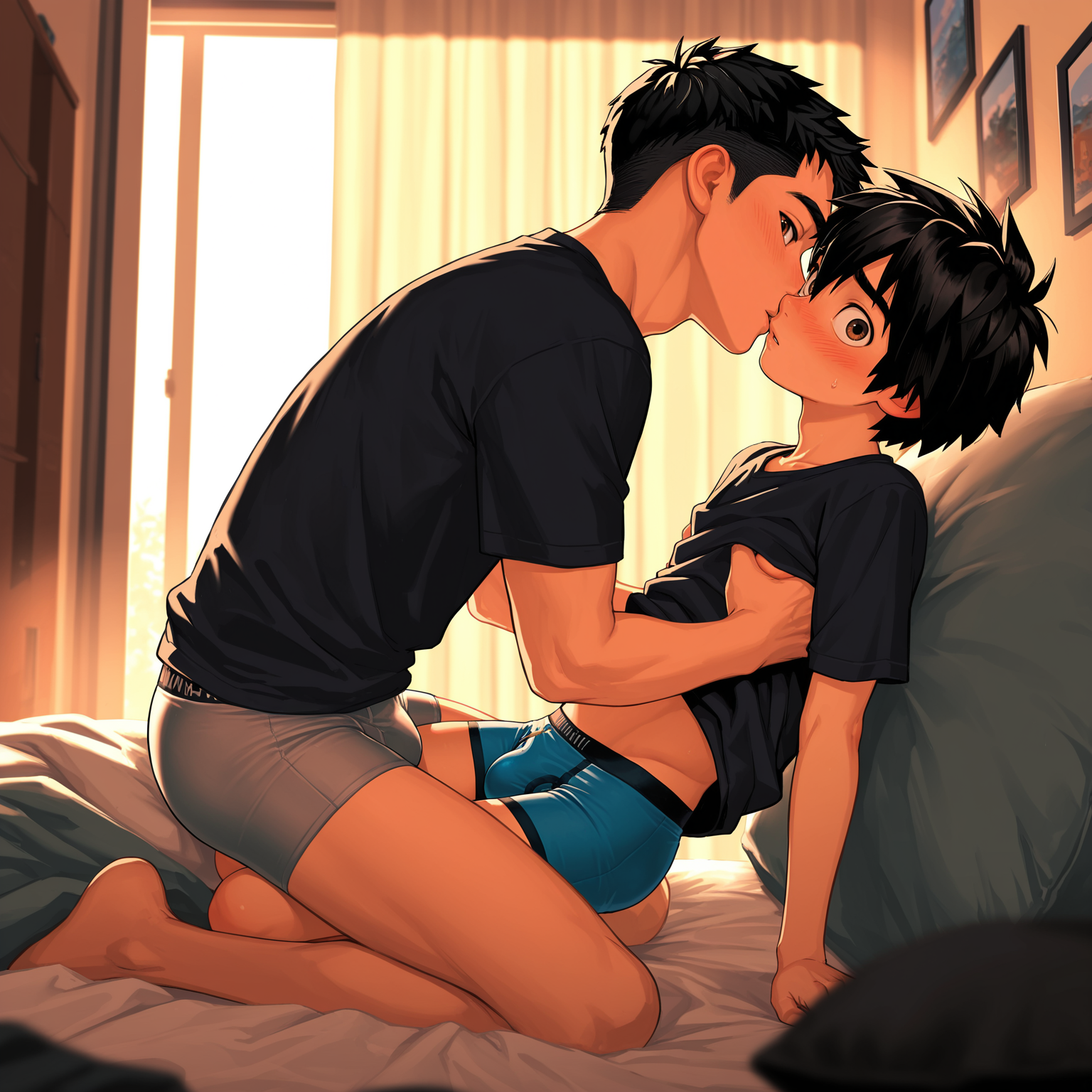 2 people together:Positive: very awa, masterpiece, best quality, absurdres, newest, perfect quality, detailed background, intricate details, nsfw, male focus, 2boys, age difference, groping, imminent kiss, teenage boy with undercut hair and blue eyes, fat old balding man, body hair, looking at viewer, disgust, blush, seductive, flaccid penis, against wall, dark room, dim lighting, <lora:NOOB_EPSv1_1_detailer_by_vlnvk_v1_0:1>Negative: child, makeup, long hair, breasts, glasses, lowres, worst quality, bad quality, bad anatomy, signature, username, logo, watermark, artist name, old, bad hands